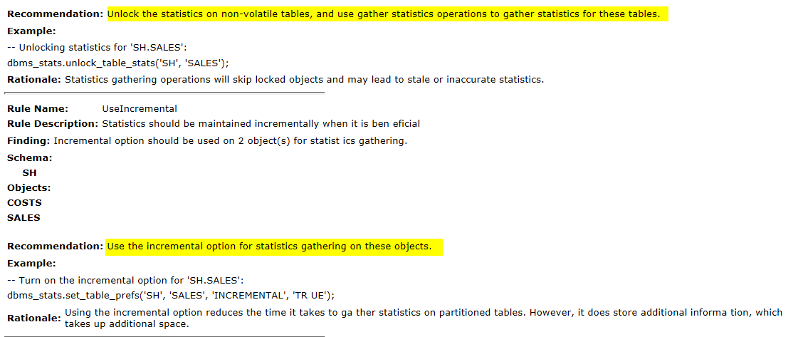 SELECT DBMS_STATS.REPORT_ADVISOR_TASK(