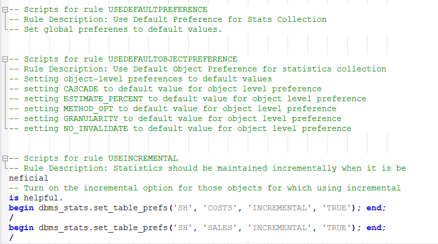 Weiterhin ist es auch möglich, mit der Funktion SCRIPT_ADVISOR_TASK ein Skript zu generieren, das die Empfehlungen des Optimizer Statistics Advisors implementiert. Es enthält PL/SQL Aufrufe, die man einfach ausführen/ablaufen lassen kann.